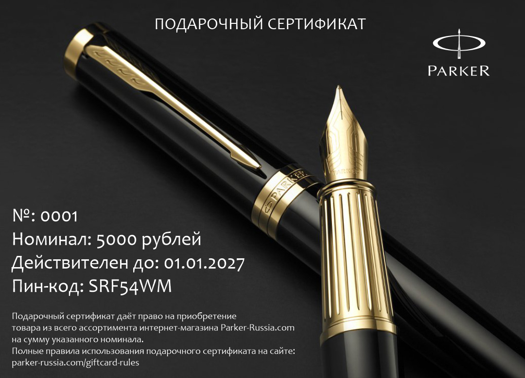 Подарочный сертификат Parker 5000 от официального дилера Parker в Новочеркасске. Вы можете дополнительно заказать гравировку, которая подчеркнет Вашу оригинальность и придаст памятность статусному подарку. Все ручки Паркер поставляются в фирменном футляре.